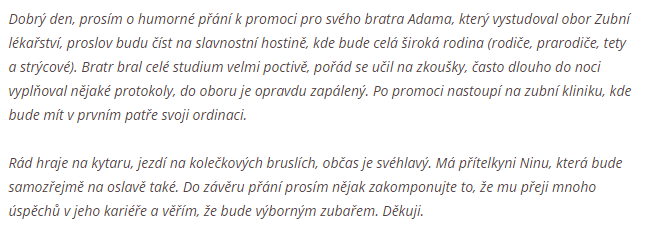 Stačí, když nám novopečeného absolventa dostatečně popíšete (jeho studium, koníčky, budoucí profesní zájmy apod.) O složení textu blahopřání k promoci už se postaráme! Vašeho zadání se ujme vždy jeden z našich zkušených básníků.
