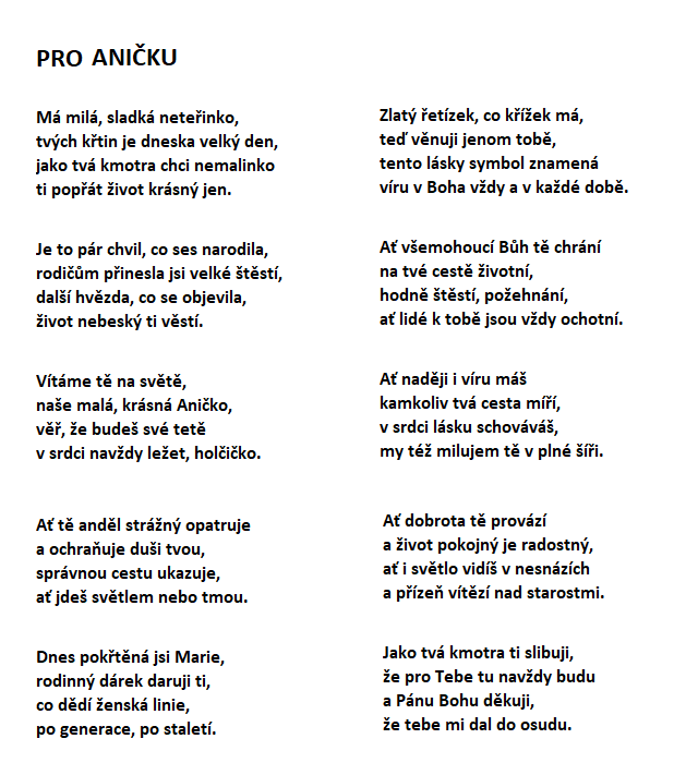 Zadání: Dobrý den, prosím o sepsání blahopřání ke křtu pro moji neteř Aničku (bude pokřtěná Marie), které jdu za kmotru. V době křtu jí bude 5 měsíců. Je prvním dítětem svých rodičů. Dostane zlatý řetízek s křížkem, který se dědí v naší rodině po generace v ženské linii. Od prababičky ho dostala naše babička, poté maminka a pak já. Dostává ho vždy nejstarší narozené děvče v rodině. Já mám ale dva syny, tudíž jej ráda daruji neteři, aby se tradice udržovala dál. Třeba ho jednou daruje dále svojí dceři nebo dceři některého z mých synům, uvidíme :-)
