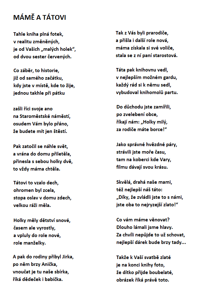 Máma dělala léta letoucí starostku v naší obci, táta vedl knihovnu, dokonce tu vybudoval knižní klub. Oba jsou strašně oblíbení, pro obec udělali velký kus práce. V důchodu pak začali jezdit každý rok na Filmový festival do Karlových Varů, kde se jim moc líbí, už tam byli celkem osmkrát. Na závěr jim chceme říci, že jsou nejlepší rodiče a prarodiče na světě a že je máme rádi. Na konci fotoknihy bude překvapení, fotka z ultrazvuku. Anička totiž čeká první miminko, takže budou mít první pravnouče. Prosíme, ať to je v poslední sloce jako překvapení. Děkuji.