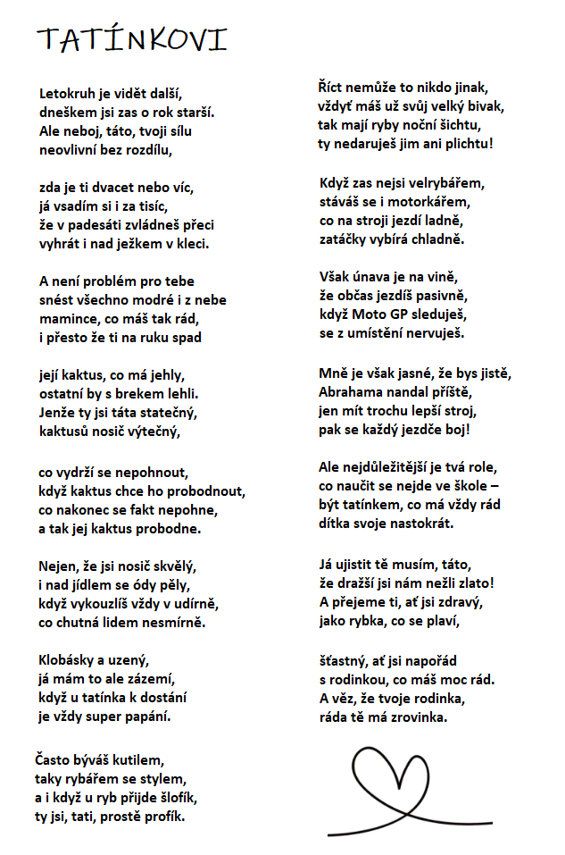 Dobrý den, prosím o složení básně pro k 50. narozeninám pro tatínka. Je to vášnivý kutil a rybář – má velký bivak, chytá i v noci,. Dále je motorkář – má starší motorku na které jezdí, jinak kouká na Moto GP, fandí Abrahámovi. Je to taky kuchař (udírna je jeho doména) a milující manžel, který podporuje naši mamku ve všech koníčcích. Mezi hlavní patří například pěstování kaktusů. Z pravidelného stěhování kaktusů do vytápěného skleníku se stal rituál. Jednou mu při stěhování ten největší kaktus probodnul nohu. Prosím, ať báseň obsahuje tedy i narážku na rizika s kaktusy spojená :-)